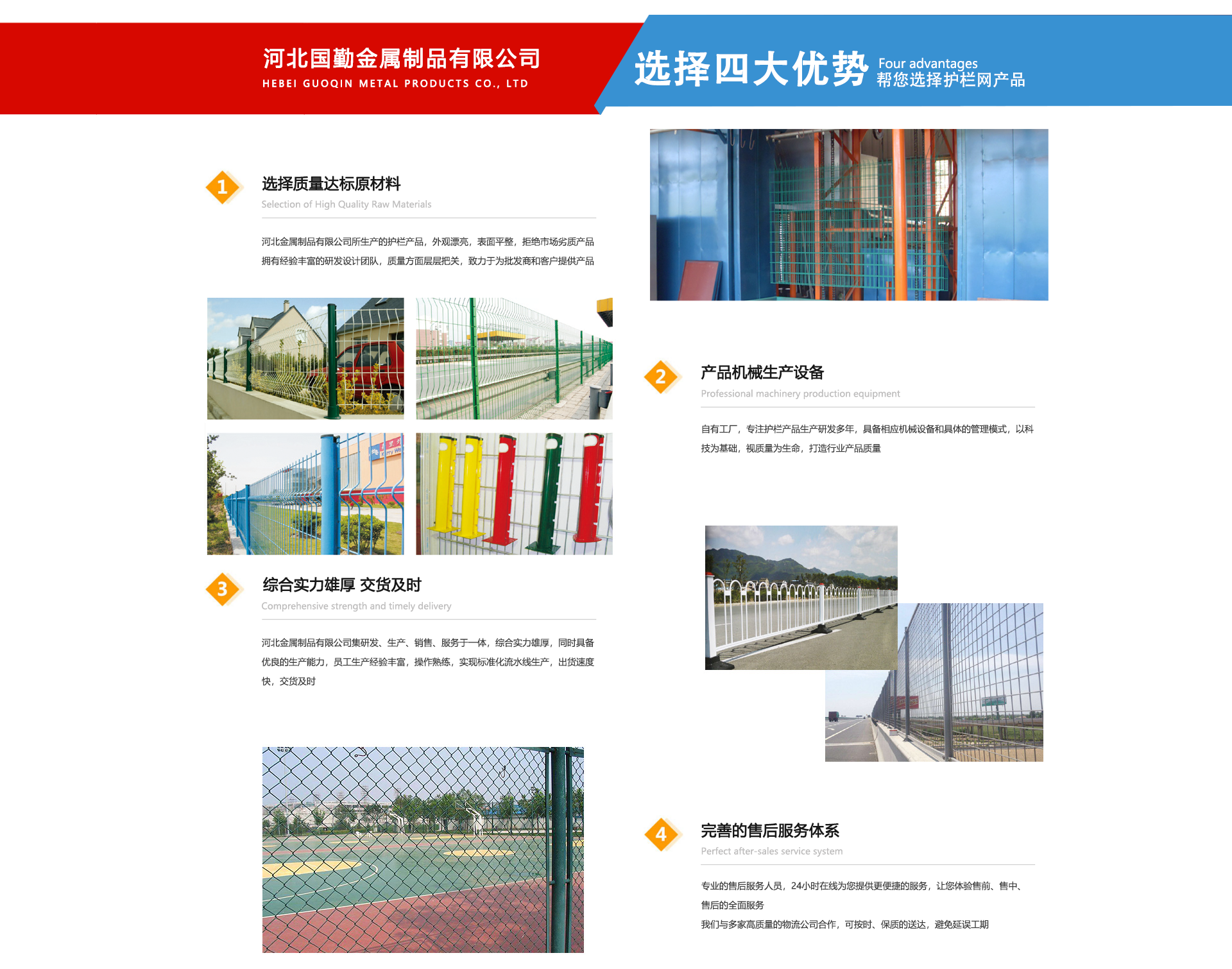 河北國(guó)勤金屬制品有限公司位于亞洲較大的絲網(wǎng)生產(chǎn)基地--享譽(yù)世界的“中國(guó)絲網(wǎng)之鄉(xiāng)”美譽(yù)的河北省安平縣境內(nèi)。主要是以研發(fā)設(shè)計(jì)、制造生產(chǎn)、銷售服務(wù)于一體的高科技現(xiàn)代化企業(yè)。河北國(guó)勤金屬制品有限公司主營(yíng)產(chǎn)品有護(hù)欄網(wǎng),隔離網(wǎng),市政工程,草坪護(hù)欄等各種系列產(chǎn)品的制造廠家。我廠產(chǎn)品被廣泛應(yīng)用于公路、石化、化工、港口、合金、電力、造紙、鋼鐵、建材、市政、石油、污水處理及一般工業(yè)廠房、市政建設(shè)等各個(gè)領(lǐng)域。公司自成立以來一直為客戶提供優(yōu)良,貼心的服務(wù)。從售前售中售后我們都以客戶為導(dǎo)向,以設(shè)計(jì)先進(jìn)、高科技手段、價(jià)格低質(zhì)量?jī)?yōu)等多方面為客戶提供整體全面的服務(wù)。我們相信科技創(chuàng)新的力量,本廠在產(chǎn)品技術(shù)基礎(chǔ)上不斷探索與創(chuàng)新,力求以更高品質(zhì)的產(chǎn)品、更合理的價(jià)格、更完善的售后服務(wù)、不斷豐富的產(chǎn)品線滿足于每一位客戶的需求。